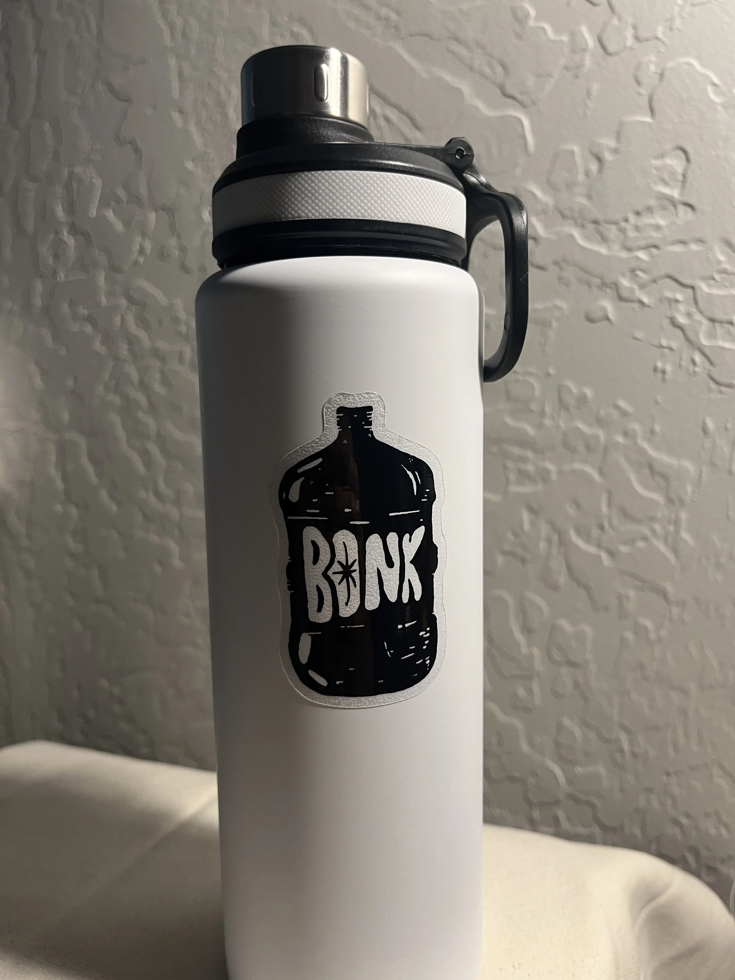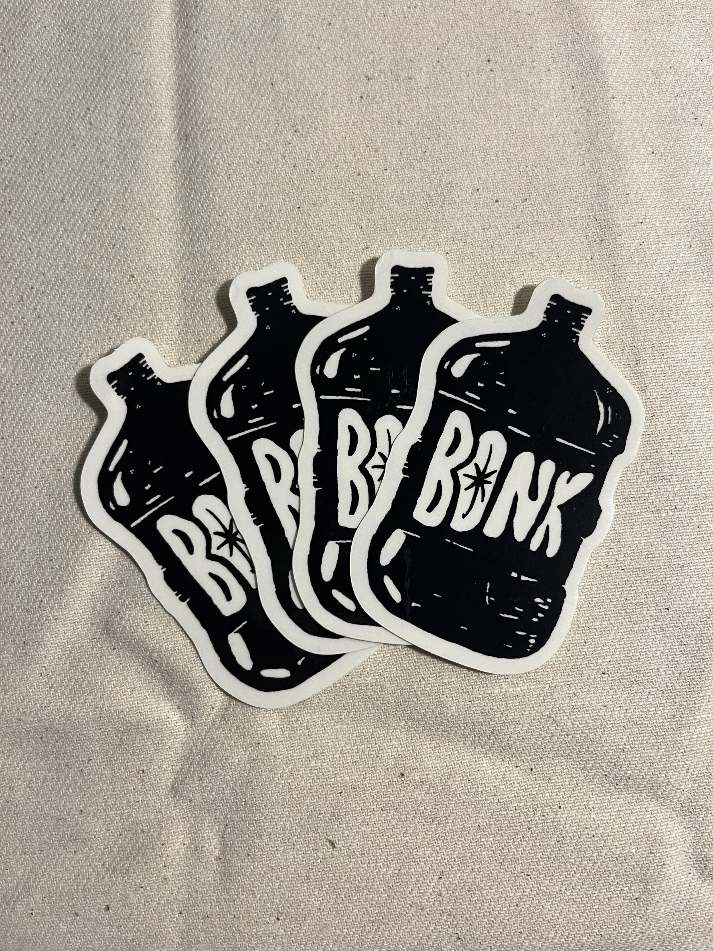 "BONK" Sticker Clear Vinyl: This sticker comes on two different vinyls, white and clear. It features an exclusive water jug illustration. The jug symbolizes anti-police/anti-militarized police sentiment stemming from the numerous protests on college campuses against the genocide in Palestine.